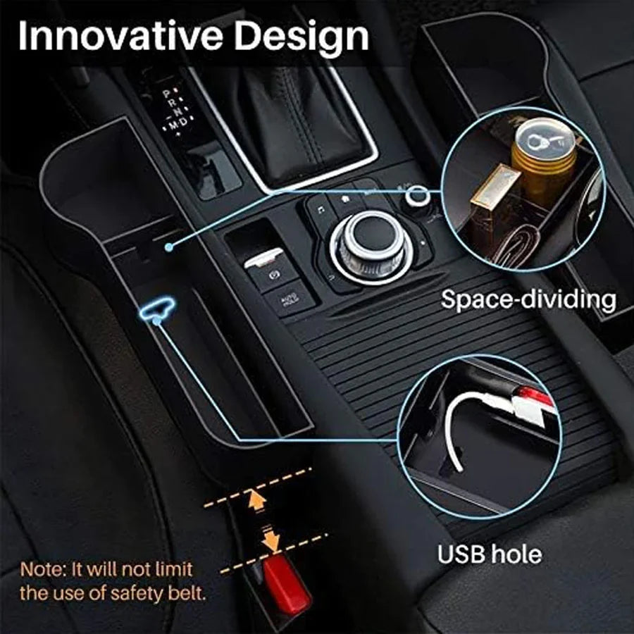 Innovative Design -- Car side seat storage is designed with cup holder for a soda can and USB hole for easily cellphone charging. Besides, it is also great for cards, keys, wallet, phone.