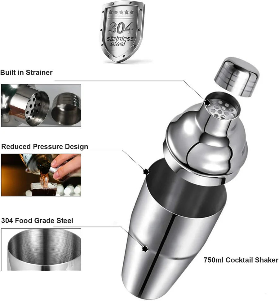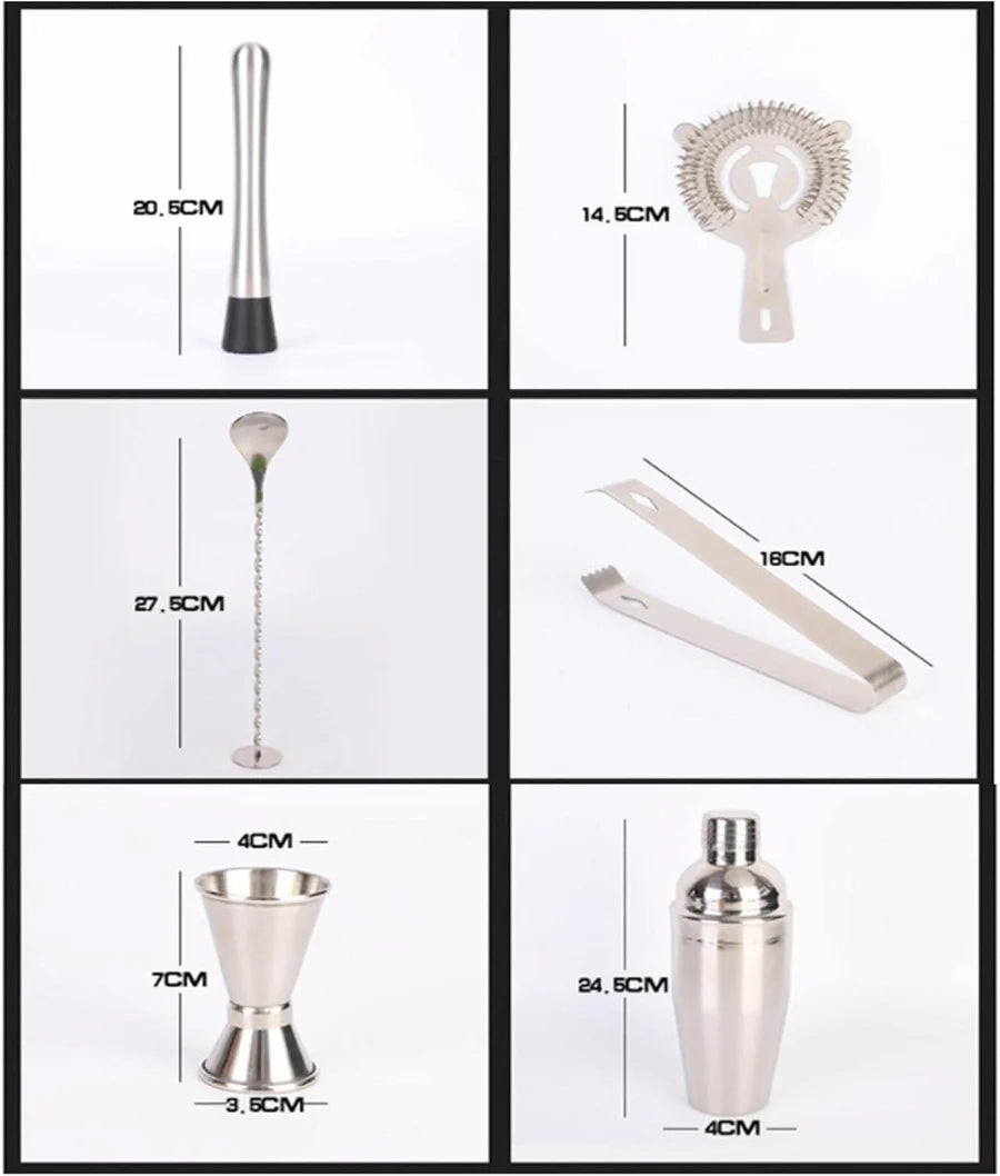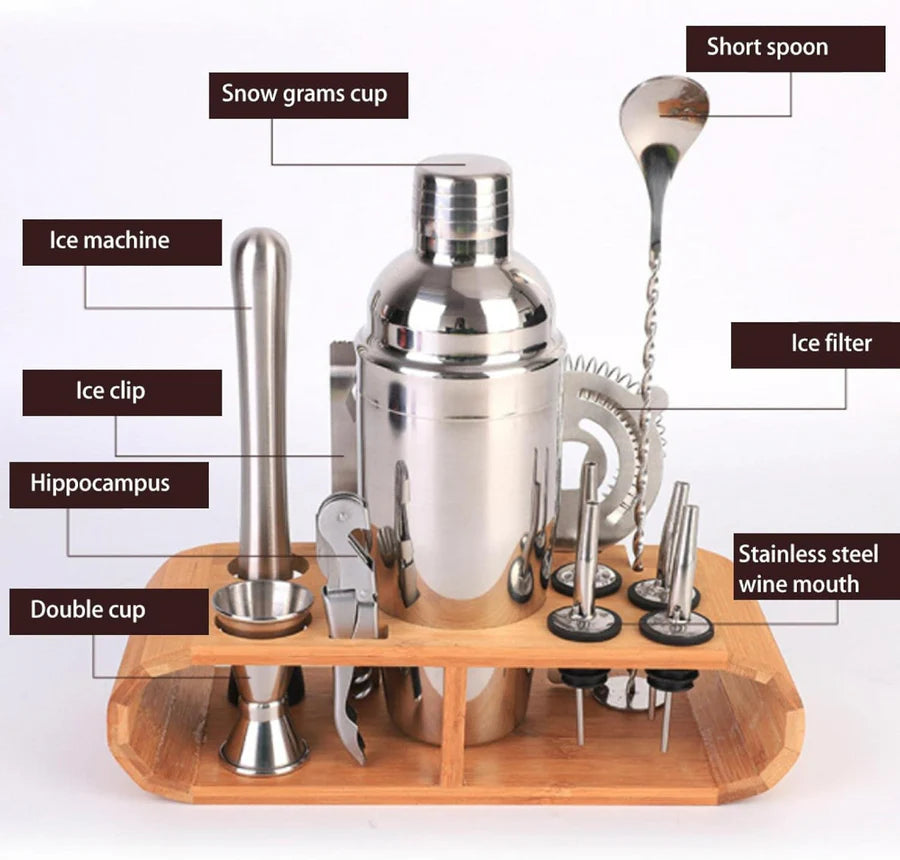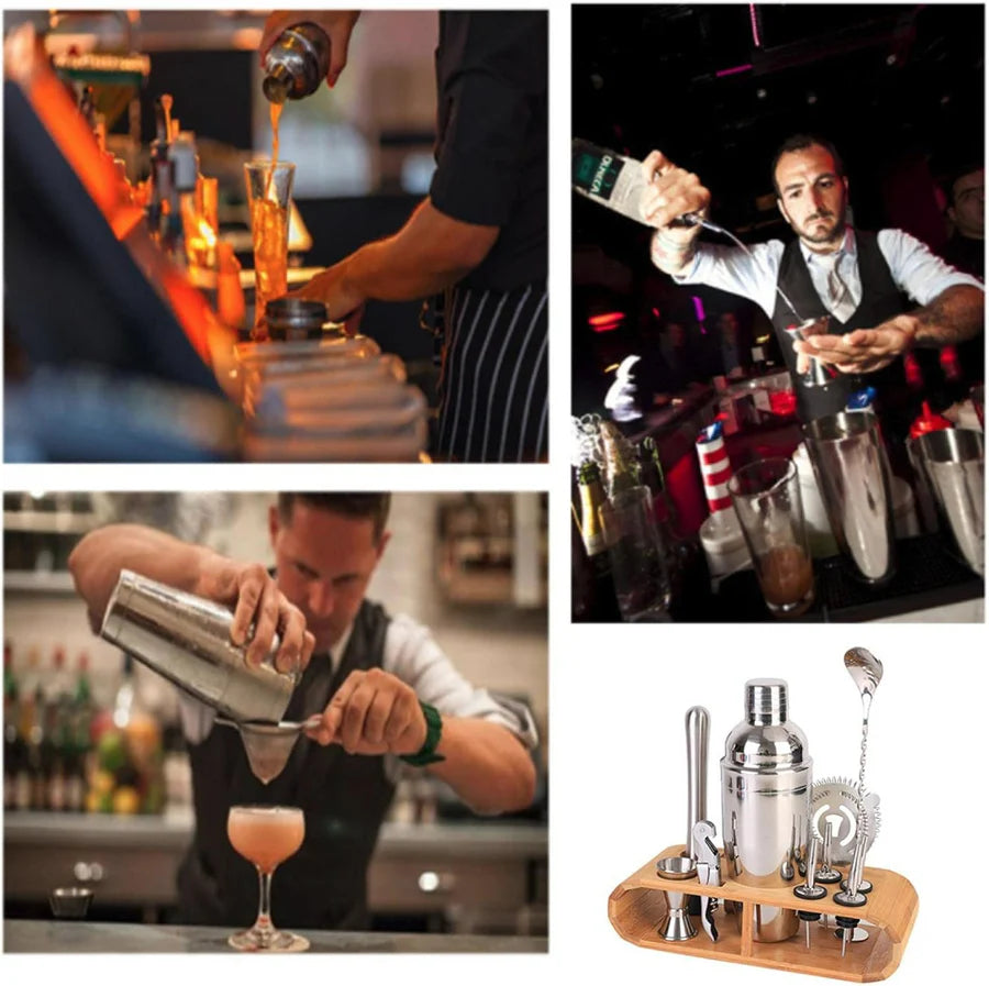 A 12-piece bartender kit featuring a 25oz stainless steel martini shaker, bamboo stand, and mocktail recipe booklet. The perfect set for mixing cocktails with style and precision.